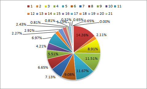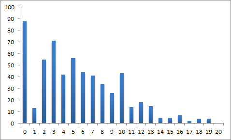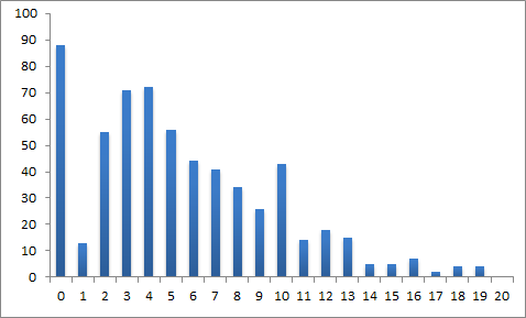 \(\begin{array}{|c|c|| c|c|} \hline \mbox{Modalité} & \mbox{Effectif} & \mbox{Modalité }& \mbox{Effectif} \\ \hline 0 & 88 & 10 & 43 \\ 1 & 13 & 11 & 14 \\ 2 & 55 & 12 & 18 \\ 3 & 71 & 13 & 15 \\ 4 & 72 & 14 & 5 \\ 5 & 56 & 15 & 5 \\ 6 & 44 & 16 & 7 \\ 7 & 41 & 17 & 2 \\ 8 & 34 & 18 & 4 \\ 9 & 26 & 19 & 4 \\ & & 20 & 0 \\ \hline \end{array}\)
